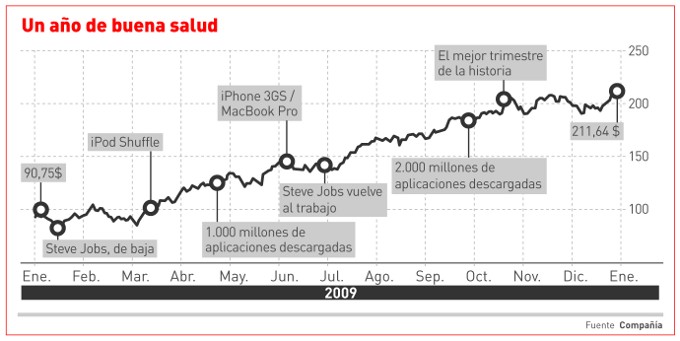 Por consiguiente, Apple tendría asegurados unos niveles de crecimiento que para sí quisieran otras empresas del sector. En la última sesión del 2009, su cotización fue la más alta de su historia, 211,61 dólares, con pronósticos de subida. Los analistas más cautos dicen que en 2010 alcanzará los 235, y los más entusiastas la elevan hasta 260 o más. De la buena salud de la compañía nadie tiene dudas, y si algo han demostrado las circunstancias del 2009 es que Steve Jobs no tiene sustituto que iguale sus méritos, pero también que Apple puede funcionar incluso en su ausencia.