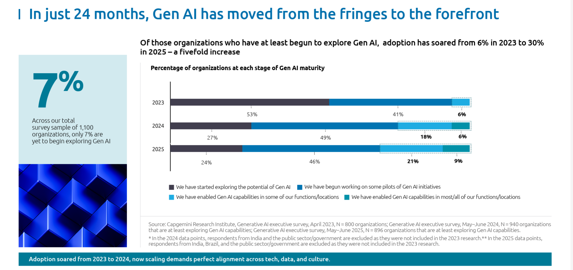 Nadie pone en duda el vertiginoso ascenso de la IA, pero los números no dejan de sorprender. En 2023, un 6% de la muestra había adoptado la IA generativa que tenía menos de un año de vida, pero en la edición 2025 ya eran un 30%. Además, el 93 ya exploran, han puesto en marcha pilotos o han habilitado capacidades con una perspectiva de adopción.