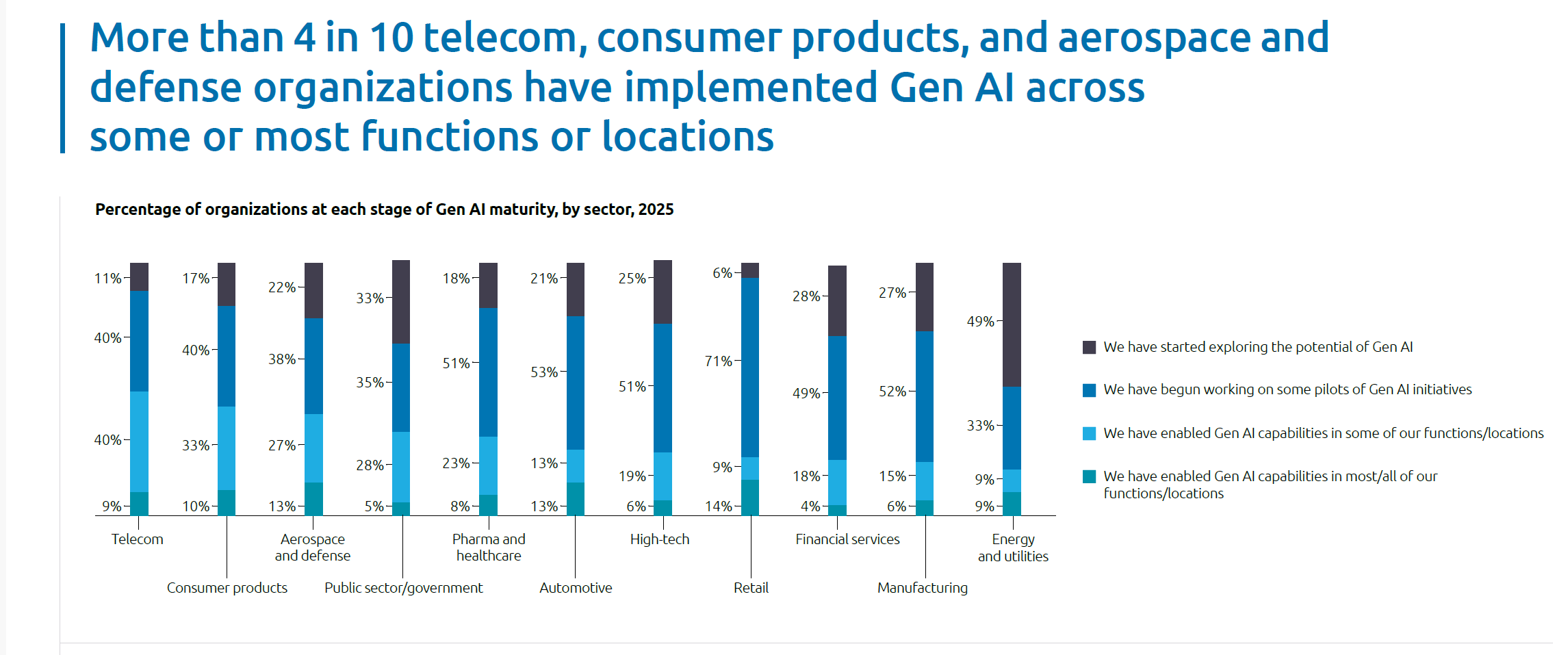 El sector de las telecomunicaciones lidera con holgura la implementación: un 49% de sus empresas dice tener proyectos relacionados, sean de alcance total o parcial. Le sigue el sector de productos de consumo, tras el que viene el aeroespacial y la defensa.