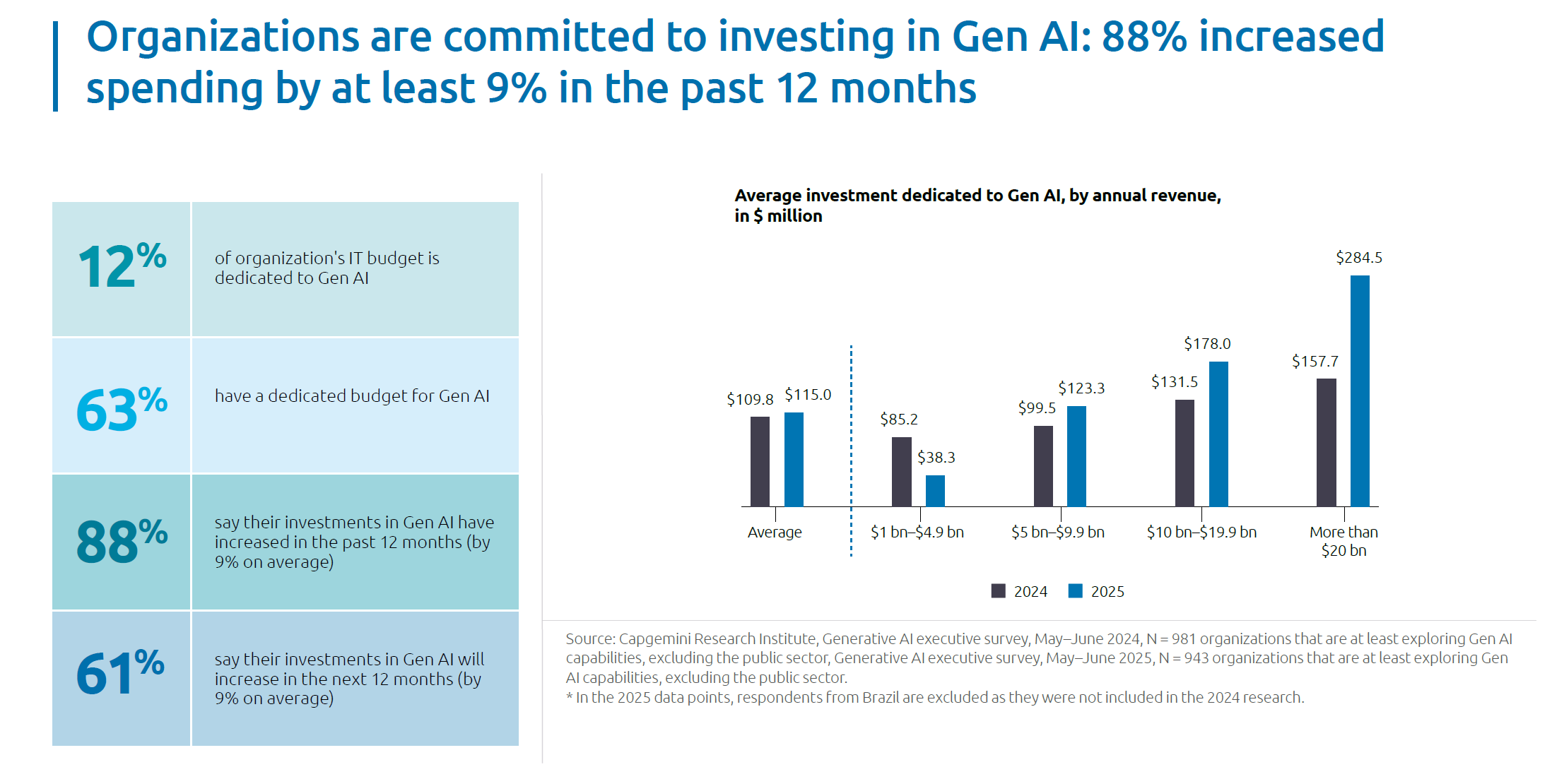 Entre las compañías representadas en el estudio, el 63% cuenta con un presupuesto dedicado a la IA o influido directamente por ella. Las más grandes, aquellas que facturan más de 20.000 millones de dólares al año, han elevado su inversión, de media, desde los 178 millones de dólares en 2024 a los 284,5 millones previstos en 2025.