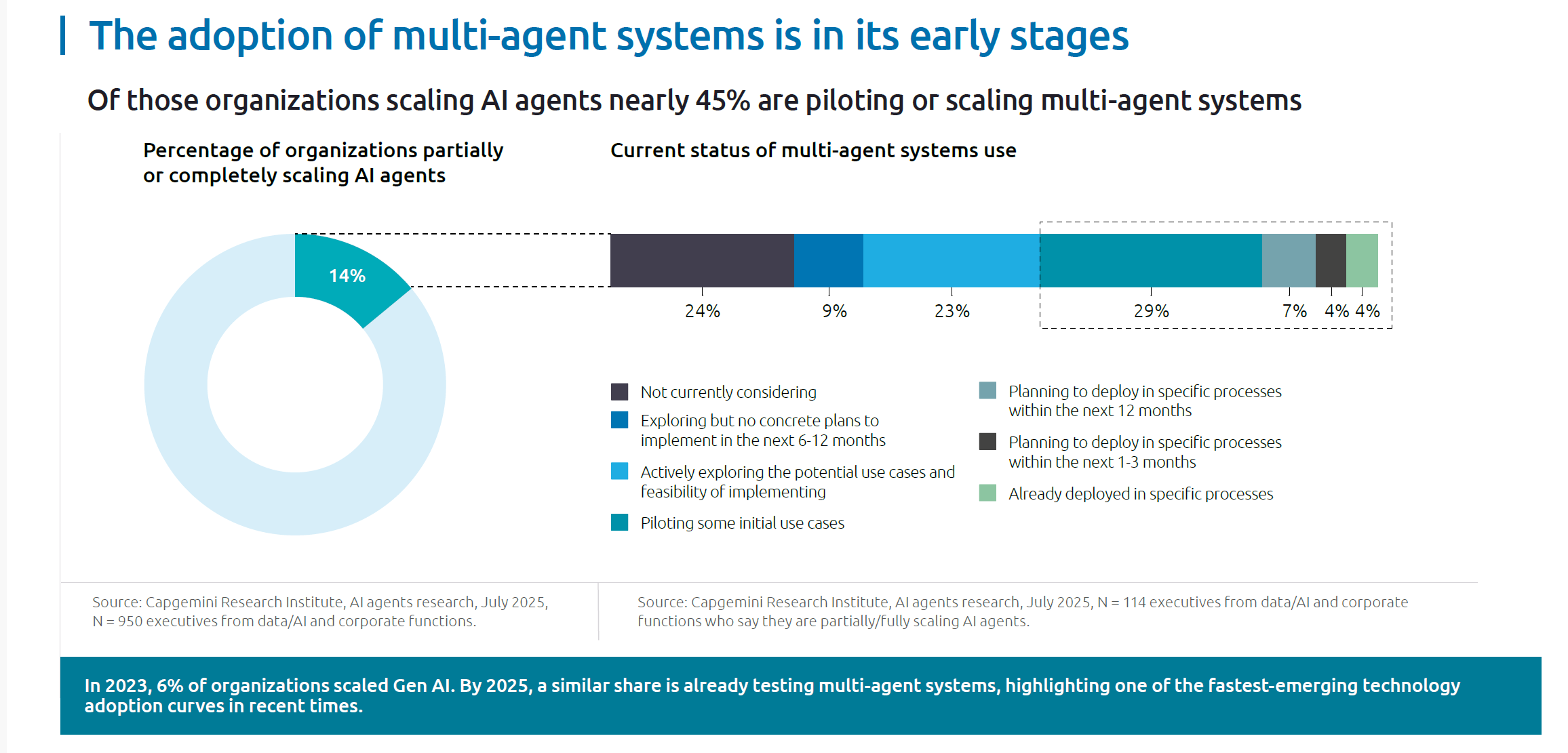 Uno de los temas más interesantes que trata el Capgemini Research Institute es el rol que juegan los incipientes agentes de IA, que en realidad consisten en aplicaciones con una capa de inteligencia artificial generativa. De esta forma, actúan en base a sistemas de razonamiento capaces de tomar decisiones autónomas para alcanzar objetivos específicos. La foto general es la siguiente: un 14% de las empresas ya han puesto en marcha agentes de IA (el 12% lo ha hecho de forma parcial y un 2% ha llevado a cabo un despliegue general en sus operaciones).
