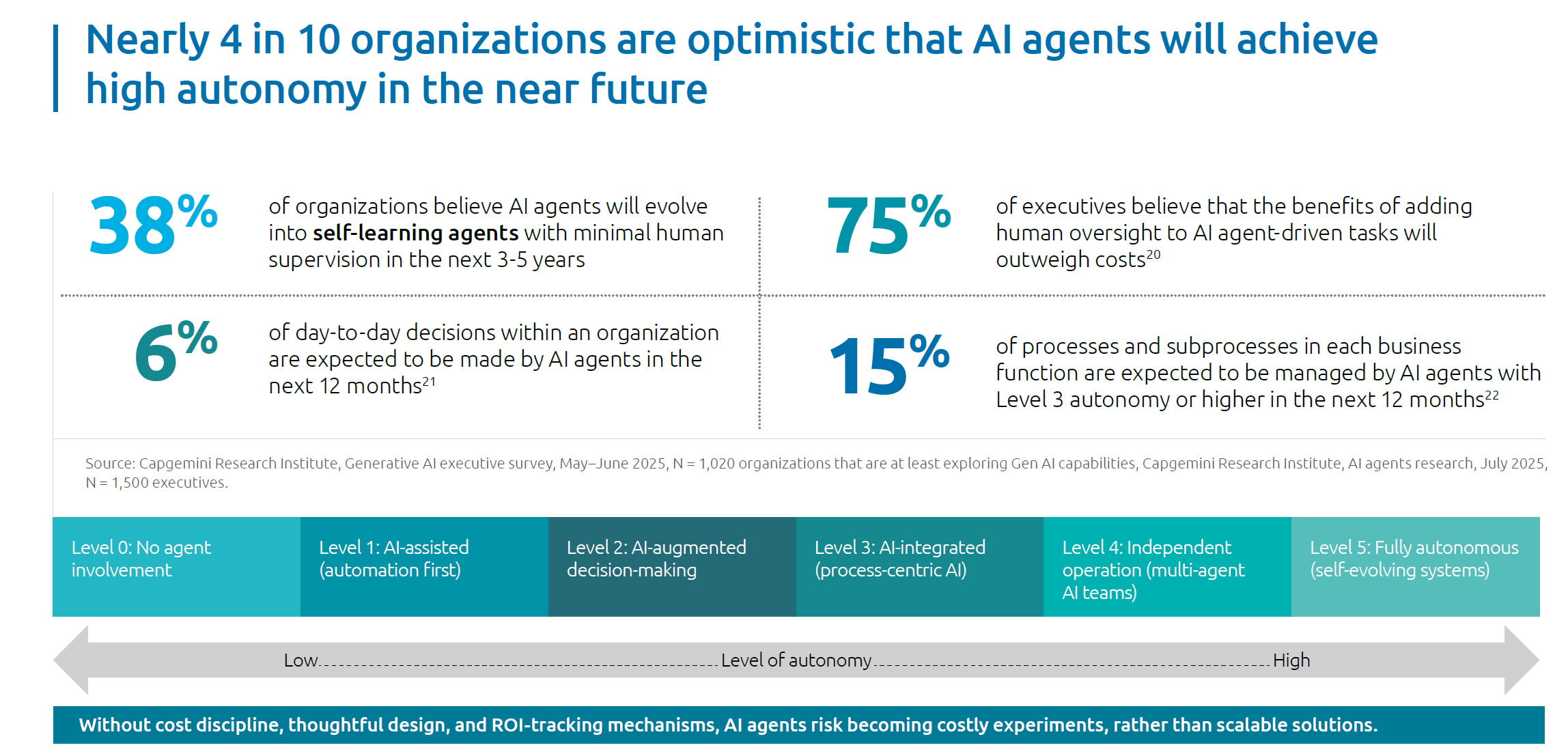 Proliferan y seguirán proliferando estudios y predicciones acerca de la adopción de la inteligencia artificial sin que resulte fácil hacerse una idea clara del panorama. Algunos hasta podrían ser causa de confusión: tópicos, vaguedades e intereses creados son habituales, entre otras cosas porque la IA aún no ha demostrado que sus aplicaciones pueden ser probadamente rentables. El informe Harnessing the value of AI. Unlocking scalable advantage , elaborado por el Capgemini Research Institute, aporta munición al debate. Y lLo hace con la delicadeza de centrar el foco en la utilidad práctica, explorando el papel de los agentes de IA dentro de las organizaciones , en este momento de su explosión.