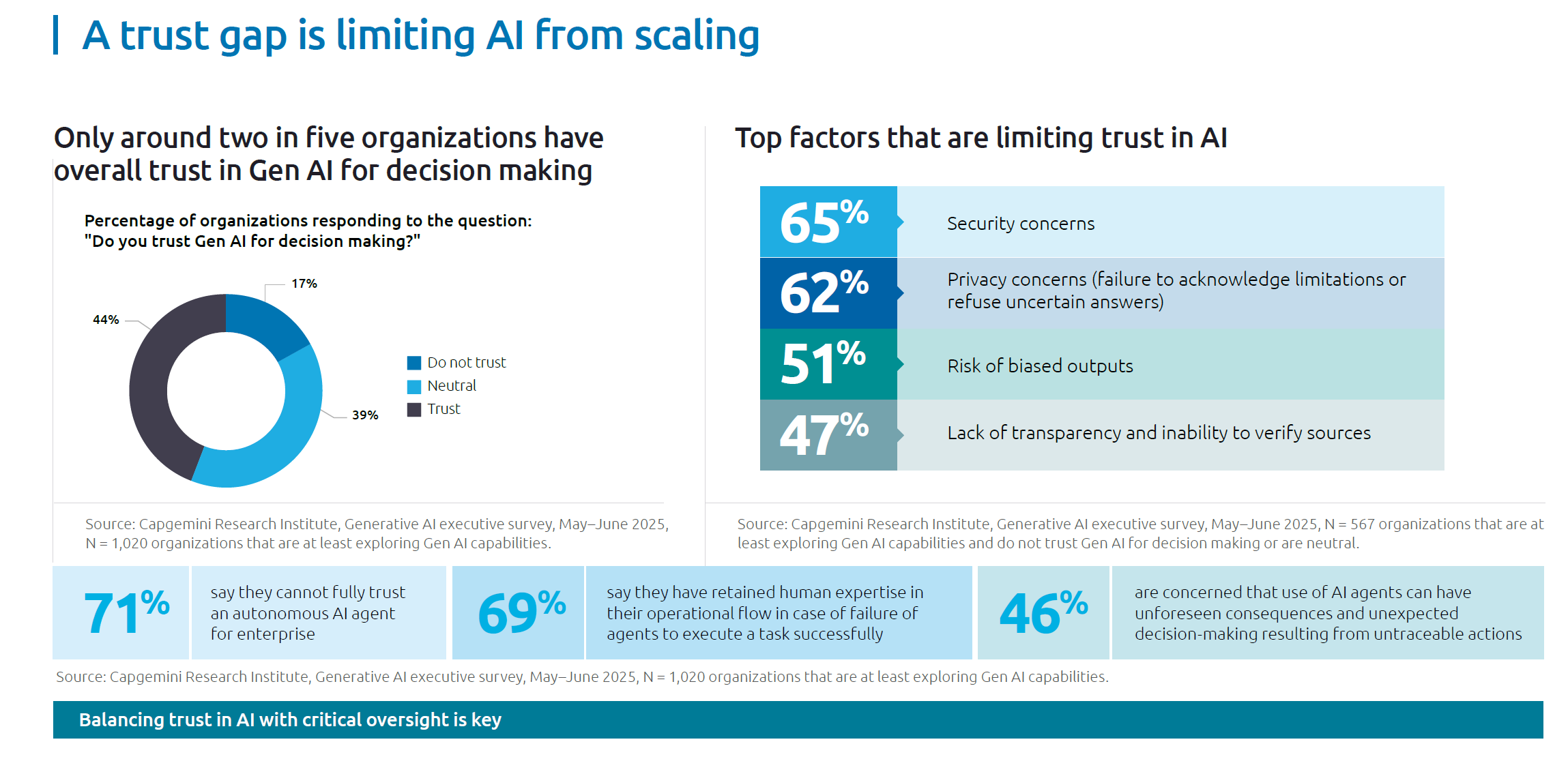 Recapitulando, la mayoría de los encuestados se muestra satisfecho con la adopción de la IA. Y entre la minoría que no lo está, un 21%, esgrime motivos que no son estrictamente novedosos. El más comentado es la falta de métricas para evaluar de una forma fehaciente el rendimiento de la tecnología, aunque también destaca la falta de metodologías para el despliegue y la falta de gobernanza de datos. No dejan de ser carencias habituales aún por resolver, propias de una tecnología que ha entrado en tromba en el escenario, en opinión de Capgemini. Las empresas no quieren quedarse rezagadas, pero no por ello les apetece dar palos de ciego.