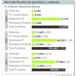 Los netbooks se han elevado hasta el 11,7% del valor total del mercado de portátiles. Sin embargo, no ha sido suficiente para corregir la bajada de otras categorías en 2009, ni lo será en 2010. En cierto modo, esa categoría peculiar ha fijado un umbral al descenso de precios de los notebooks (pantallas superiores a 13 pulgadas), permitiendo que el agregado cayera ´sólo´ un 12% impidiendo así que la crisis fuera más seria. La sustitución de desktop por portátiles ha dado un cierto vigor a la demanda, con un incremento del 12% que se convertirá en 21% en 2010.