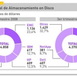 El descenso del mercado de almacenamiento en disco continúa, arrastrado por la tendencia de los servidores, aunque es cierto que en el tercer trimestre se ha suavizado. No obstante, si se mide por la capacidad total, el mercado ha crecido un 21% sobre el 2008. EMC mantiene una holgada primera posición, y su cuota es prácticamente equivalente a la suma de sus dos principales rivales: IBM y HP (único que ha perdido siete décimas en el reparto). El reciente anuncio de una alianza de EMC con Cisco y VMware es un signo precursor de que en el mercado se abre una nueva fase de intensa competencia, sobre el telón de fondo de las iniciativas de cloud computing.