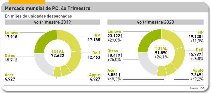 Ahora sí, ¿qué muestra el ranking de IDC? En primer lugar, que el mercado creció un 26,1% en el cuarto trimestre y un 13,1% en todo 2020. No se conocía un resultado mejor desde 2010, cuando el mercado mundial creció un 13,7%. Pero esta proeza ha significado que “cada segmento de la cadena de suministro fue llevado a sus límites, pero aun así la producción no ha dado abasto con la demanda”, explica el analista sectorial Jitesh Ubrani.