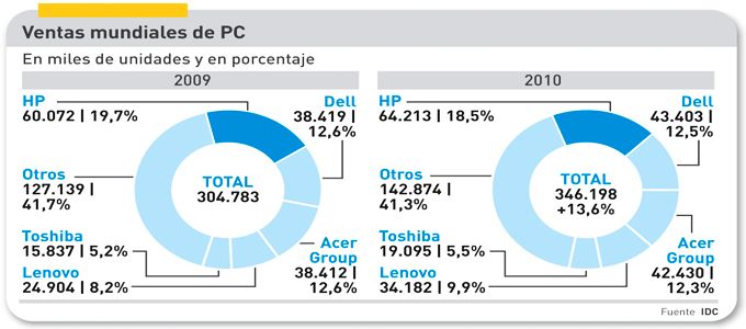 En el mundo, las cinco marcas principales han incrementado sus cifras absolutas, pero cada una tiene su propio balance. HP, que ha vivido una mala racha en Estados Unidos, la compensó en otras regiones para cerrar el año con un aumento del 6,9%, aunque sacrificando doce décimas de cuota. Dell y Acer siguen disputando palmo a palmo el segundo puesto: mientras la compañía tejana se ha apoyado en los mercados emergentes, su competidora taiwanesa ha sufrido el desgaste de los netbooks. Lenovo ha vuelto por sus fueros, afianzando su cuarta posición y creciendo a un ritmo superior al resto (21%), pero ha quedado en terreno intermedio: lejos para aspirar a la tercera, y segura de que Toshiba no la atrapará.