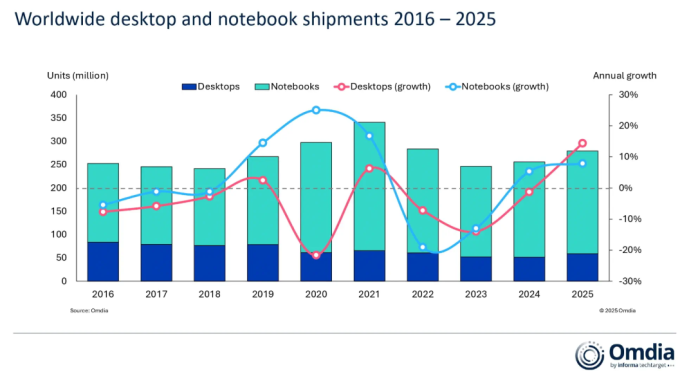 El 2025 ha sido un buen año para los fabricantes de PC: despacharon 279,5 millones de unidades [sobremesa, portátiles y estaciones de trabajo], un meritorio 9,2% de crecimiento interanual. Son cifras de la consultora Omdia, nombre adoptado por la antigua Canalys tras ser adquirida por el grupo Informa. IDC – cuyos análisis son habitualmente recogidos por este blog – eleva la cifra a 284,7 millones, que en su serie estadística equivaldría a un 8,1% de crecimiento. Más que nunca, esto es agua pasada: lo que hoy importa es el imposible ejercicio de predecir si en 2026 el mercado subirá o bajará, disonancia que es consecuencia de la escasez y la carestía de los chips de memoria y otros componentes.