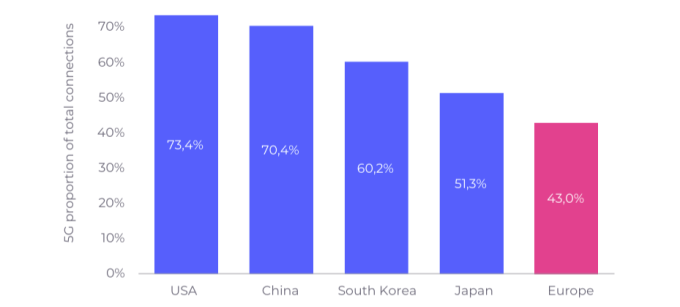 La adopción de 5G en Europa a finales de 2025 también es mucho más baja: el 43%. En Estados Unidos es del 73,4%, en China del 70,4%, en Corea del Sur del 60,2% y en Japón del 51,3%.