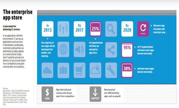 Tras los aspectos demográficos y sociológicos, el estudio se centra en aportar las tendencias de las TI que – según el espíritu grandilocuente que marca la pauta de este género de estudios – van a mejorar las vidas de los ciudadanos, o eso prometen. El repertorio es largo. Las aplicaciones y los programas en general consolidarán aún más su papel de herramientas competitivas. O sea que el software estará en todas partes, se accederá a él desde una multiplicidad de dispositivos y cumplirá con el ´paradigma de las tres C`, a saber: Computing Everywhere (sensores, automóviles, relojes, Internet de las cosas), Consumerization (diseñado en función de las necesidades y las opiniones de los usuarios finales) y Commoditization (entregado como servicio y accesible a todos los públicos), todo lo cual exigirá centrarse en los requisitos funcionales, por encima de los puramente tecnológicos.