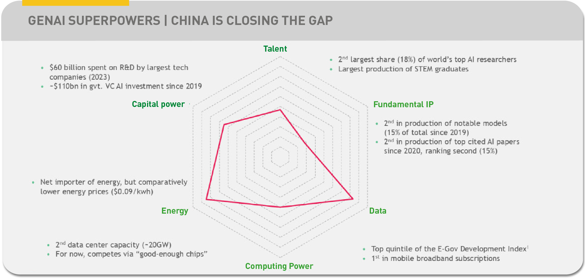 Este gráfico concerniente a Estados Unidos confirma lo que cualquiera diría intuitivamente: la capacidad de financiar proyectos de I+D (en 2023) se ha estimado en 212.000 millones de dólares. Como exportador neto de energía que es, el país se beneficia de electricidad a bajo precio, un factor que atrae la construcción de centros de datos especializados en IA, una capacidad instalada total de 45 Gigavatios el año pasado y creciendo aceleradamente. El único de los vértices en los que Estados Unidos se ve superado por China es el uso de datos, debido a que prevalece un indicador fundamental, el número de suscripciones de banda ancha móvil.