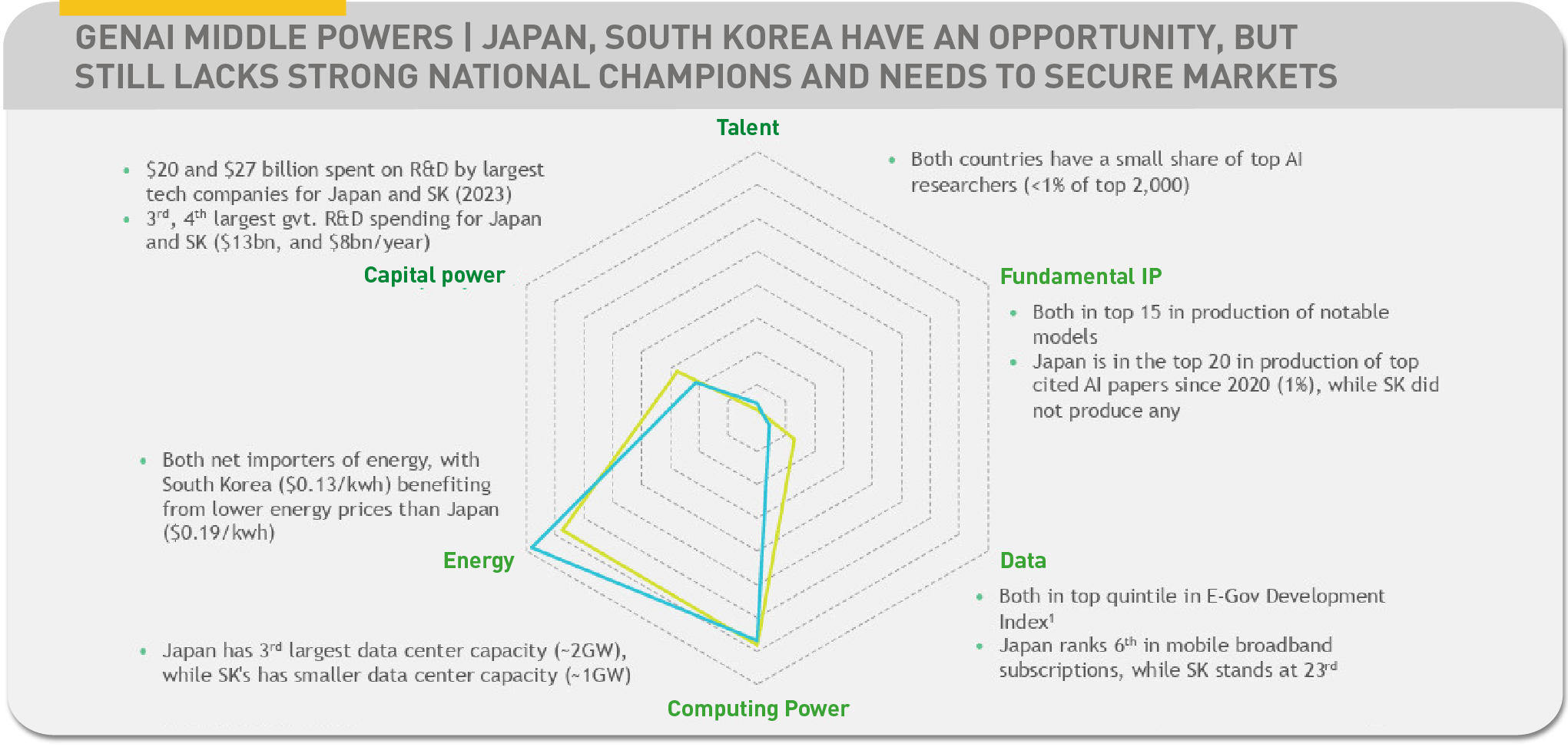 La consultora Vaishali Rastogi, responsable en BCG de la práctica TMT (Telecom, Media y Telecommunications) tomó el relevo para referirse a Japón y Corea del Sur, dos potencias asiáticas que durante décadas han presumido de sus ecosistemas tecnológicos y tratan ahora de apoyarse en esa tradición y su cadena de suministros para acentuar su presencia en la IA. Entre los países clasificados como potencias medias son los que más dinero dedican a I+D, unos 47.000 millones de dólares entre ambos, pero adolecen de una baja dotación de especialistas en la materia.
