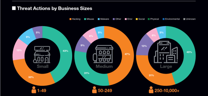 Los ataques no se producen del mismo modo en las empresas: en las pymes (1-49 empleados) y en las grandes (más de 250 el uso indebido supone la amenaza má numerosa; en las medianas, la mayor amenaza es el hackeo, notoriamente en alza.