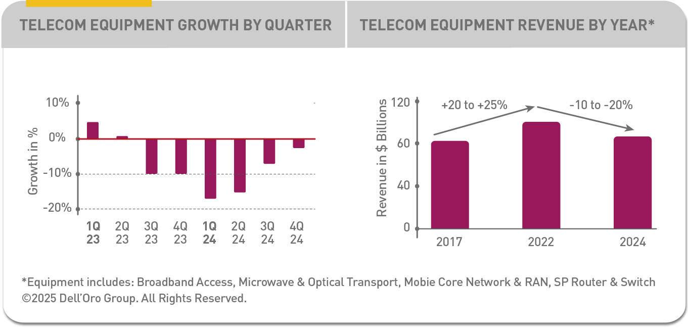 Hubo mejores tiempos para esta industria. Sin remontarse muy atrás, entre 2017 y 2022, el crecimiento de los ingresos fue notable, con un aumento del 20% al 25% llevando la facturación global de 80.000 a 100.000 millones de dólares en números redondos. Siguió un descenso hasta 2024 que sólo ahora podía mutar en tímida estabilidad. Los analistas de Dell´Oro apuntan que este año se alcanzarían, como mucho, los 85.000 millones de dólares.