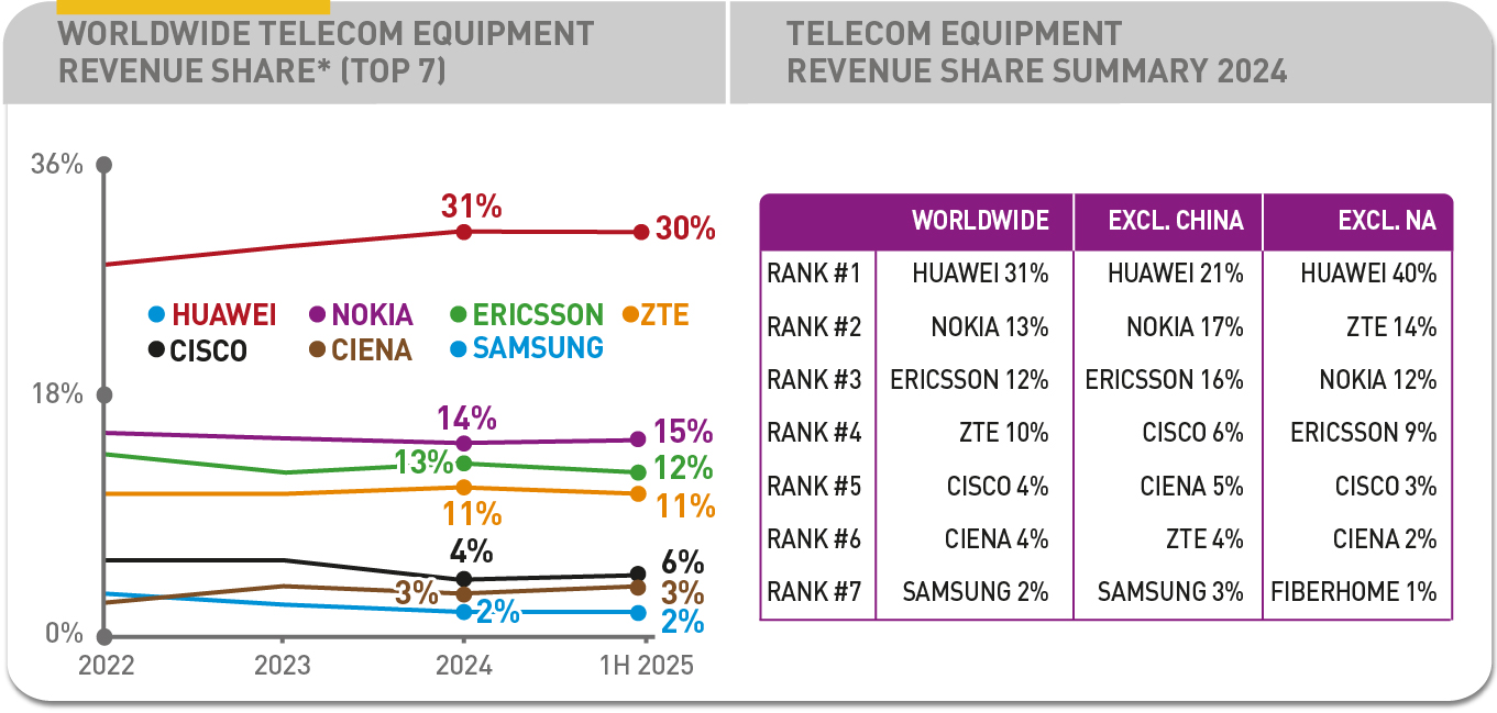 Pasar de una caída del 11% en 2024 a un crecimiento cero en la primera mitad de 2025 puede parecer una proeza, pero no arregla el estropicio. Como mucho, el mercado mundial de equipos de telecomunicaciones ganará este año dos o tres puntos, si se produjera una mejoría en el segundo semestre. Esta es la estimación de la consultora especializada Dell´Oro. Una nota relevante es que Huawei sigue siendo el primer suministrador a escala global, con un 30%. Le siguen Nokia (13%), Ericsson (12%) y otra compañía china, ZTE (10%). Estos cuatro grandes dentro de un grupo de siete, representan tres cuartas partes de un mercado mundial que el informe evalúa entre 82.000 y 85.000 millones de dólares.