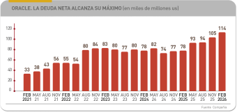 Son cifras altamente inusuales para una empresa que durante décadas ha vivido del ciclo software-mantenimiento-aplicaciones, con baja intensidad de capital y una rentabilidad satisfactoria. El giro radical dictado por Ellison se ve con más claridad en el balance que en la cuenta de resultados: los activos de infraestructura han engrosado un 92% hasta llegar a un valor en libros de 83.600 millones, a la vez que la deuda total trepaba hasta 130.000 millones, cantidad importante para una empresa cuya capitalización bursátil era ayer de 466.000 millones.
