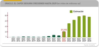 Comparativamente, la posición de Oracle en este capítulo es a la vez privilegiada y arriesgada : de los 553.000 millones en RPO, más de 300.000 millones vienen de OpenAI y el proyecto Stargate, con ostensibles carencias financieras. Por su lado, la exposición de Microsoft es del 39% y la de AWS sólo del 16%.
