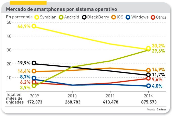 Sucintamente, la noticia dice: “el mercado mundial de sistemas operativos para móviles será dominado en 2014 por Symbian y Android, que sumarán el 59,8% de las ventas, según la firma de investigación de mercado Gartner”. Es una manera de leer el gráfico. Otra sería esta: Symbian caerá en cinco años del 46,9% al 30,2% dejándose empatar por Andoid (la diferencia de 6.000 unidades estadísticamente es despreciable). Y una tercera lectura diría que Windows Phone, en plena reinvención, pasaría del 8,7% a menos de la mitad. Este es un año raro, qué duda cabe. Gartner ya ha compilado los datos reales del primer semestre, que le permiten calcular casi 269 millones de smartphones/año, un 23,3% de aumento sobre 2009. Symbian, pese a perder siete puntos porcentuales, tiene garantizado el liderazgo, con un 40,1% de cuota, que revela la fuerza de Nokia, a pesar de sus pesares. La cifra más explosiva del informe revela que Android (47,4 millones de unidades) ha pasado en sólo un año de la quinta a la segunda posición (17,7%) y desplazará por la mínima a BlackBerry (17,5%). A quien le intrigue saber qué impacto tendrá este año el iPhone, Gartner responde que alcanzará el 15,4% del mercado, sólo un punto más que el año pasado. El farolillo rojo lo lleva Windows, único sistema operativo que, en números absolutos, se habrá vendido menos en 2010 que en 2009, lo que tiene fácil explicación: los primeros modelos de la nueva versión verán la luz en octubre.