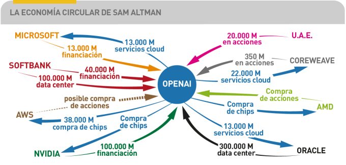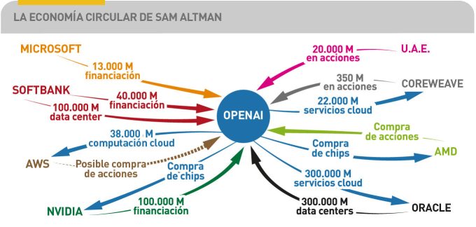 A esta insólita montaña de capital, algunos analistas añaden la circularidad como signo de riesgo sistémico y lo an como precursor de una burbuja nacida del boom de la IA. Lo cierto es que los socios de OpenAI han asumido ese riesgo sin mostrarse preocupados. Más aún: cada una de las compañías mencionadas han visto elevarse la cotización tras firmar sus acuerdos con OpenAI, por lo que, s. A este paso, Sam Altman podría adquirir fama de auténtico rainmaker.
