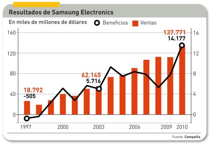 Samsung Electronics planea invertir el año próximo 38 billones de won (unos 24.500 millones de euros) para ampliar su capacidad de producción en las actividades prósperas, al mismo tiempo que reestructura los negocios declinantes. La cifra es un 30% más alta que la inversión de 2011, lo que da una idea de la agresividad con la que se aborda el futuro; al menos una tercera parte de ese monto se destinará a la división de semiconductores, centrándose en microcomponentes y pantallas para dispositivos móviles. En cambio, queda congelada la inversión en LCD y televisores, a la vista de la situación del mercado. Al cierre del tercer trimestre, los resultados de Samsung Electronics arrojaron un modesto aumento del 3% en las ventas y una drástica caída del 23% en el beneficio neto, que contrastan visiblemente con la tendencia observada en los últimos dos años. De las cuatro divisiones operativas de la compañía, sólo la de Telecom (un 35% del total) continúa creciendo en ingresos, mientras el resto (semiconductores, televisión y appliances, y display) desciende tanto en ventas como en beneficio operativo. Lo que no decae es la fe de Samsung en los semiconductores. Se propone aumentar el año próximo un 50% su inversión en plantas de fabricación de chips de memoria, procesadores para móviles y sensores para cámaras digitales. Hay una continuidad con la estrategia que tan buenos frutos ha dado: dotarse de capacidad suficiente para suministrarse a sí misma y a sus competidores. Las relaciones con Apple sirven de modelo: el 16% del valor industrial de un iPhone está representado por componentes de Samsung; al mismo tiempo, en el tercer trimestre ha superado a su rival en ventas de smartphones (en unidades).