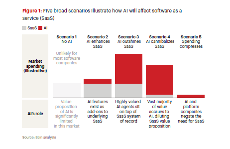 Bain plantea a los proveedores actuales cuatro escenarios posibles en este campo de batalla (sic). Desde un primero en el que la IA mejora las cualidades del modelo SaaS elevando la productividad sin reemplazar la lógica humana a un cuarto en el que la IA canibaliza las soluciones SaaS si las compañías no hacen nada para adaptarse. Entremedias, plantea otras dos: la IA puede ahorrar costes asumiendo aquellos procesos que son fácilmente replicables o la IA se ocupa de llevar la automatización a su máxima expresión, a condición de que la empresa controle su patrimonio de datos.