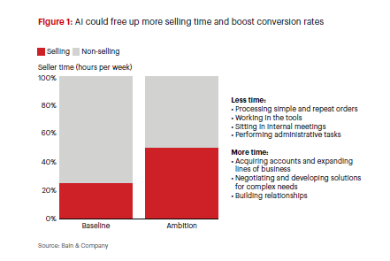 En otras páginas se identifican veinticinco casos de uso de la IA en el ciclo de venta, al que el informe asigna un papel destacado cuando afirma que la IA generativa y la agéntica pueden liberar a los vendedores tiempo que emplean en tareas rutinarias y por esa vía mejorar las tasas de conversión (ver gráfico).