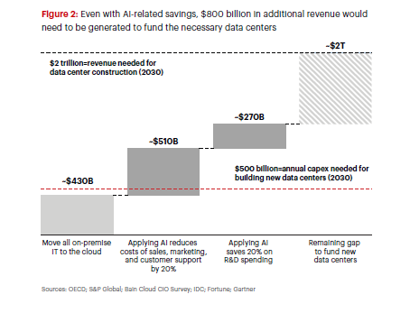 Los cálculos de Bain & Co indicarn que, incluso si las empresas trasladasen todos sus presupuestos locales de TI a la contratación de servicios cloud y, además, reinvirtieran los ahorros previstos en la aplicación de la IA en cuatro áreas esenciales (ventas, marketing, atención al cliente e I+D, la cuantía no bajaría de 800.000 millones de dólares, que resulta ser inferior a ingresos necesarios para financiar la inversión total.